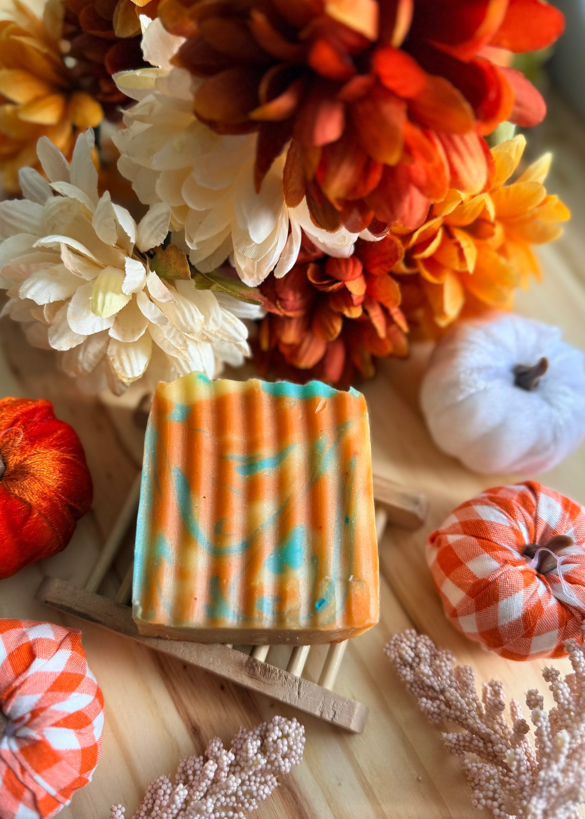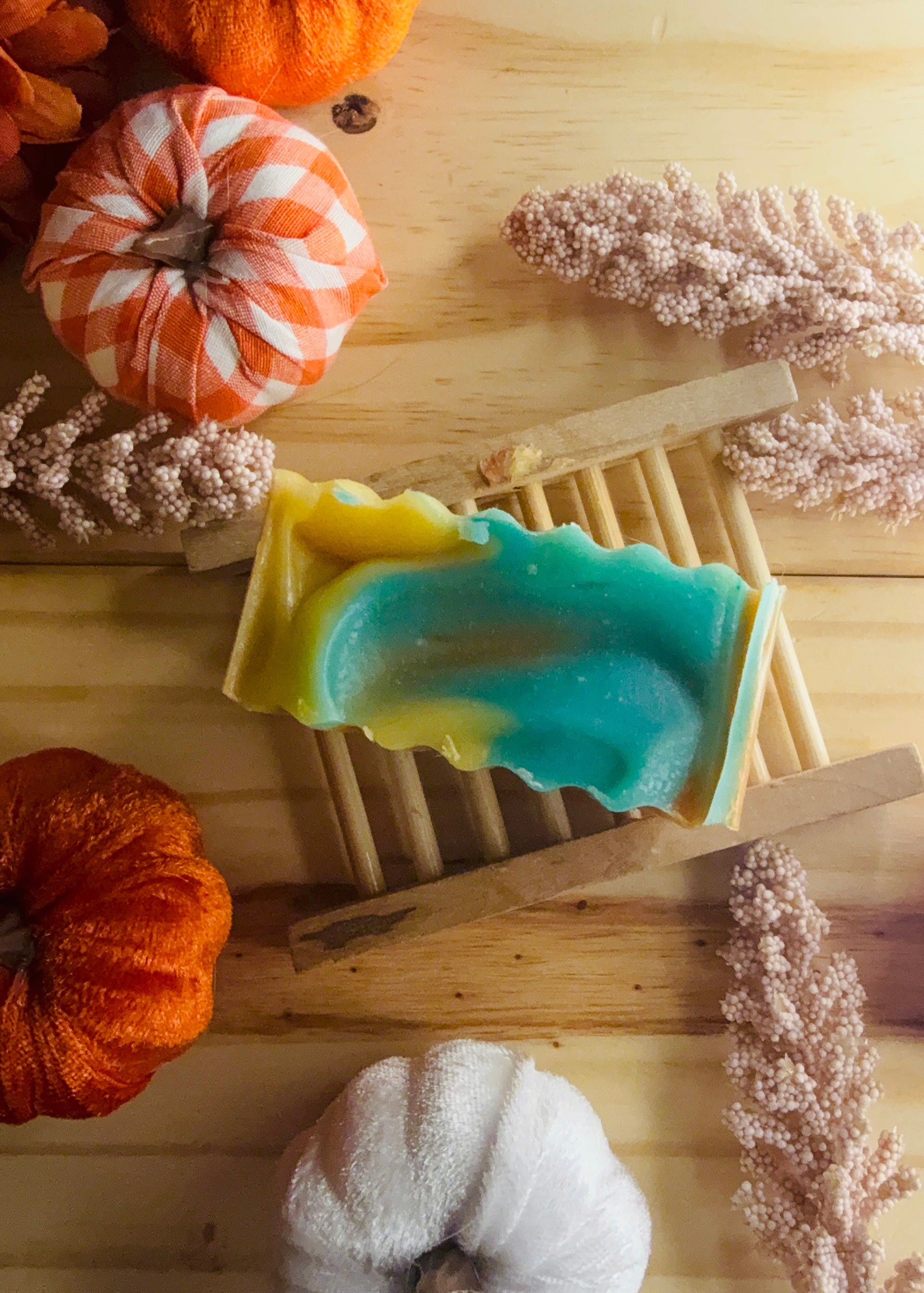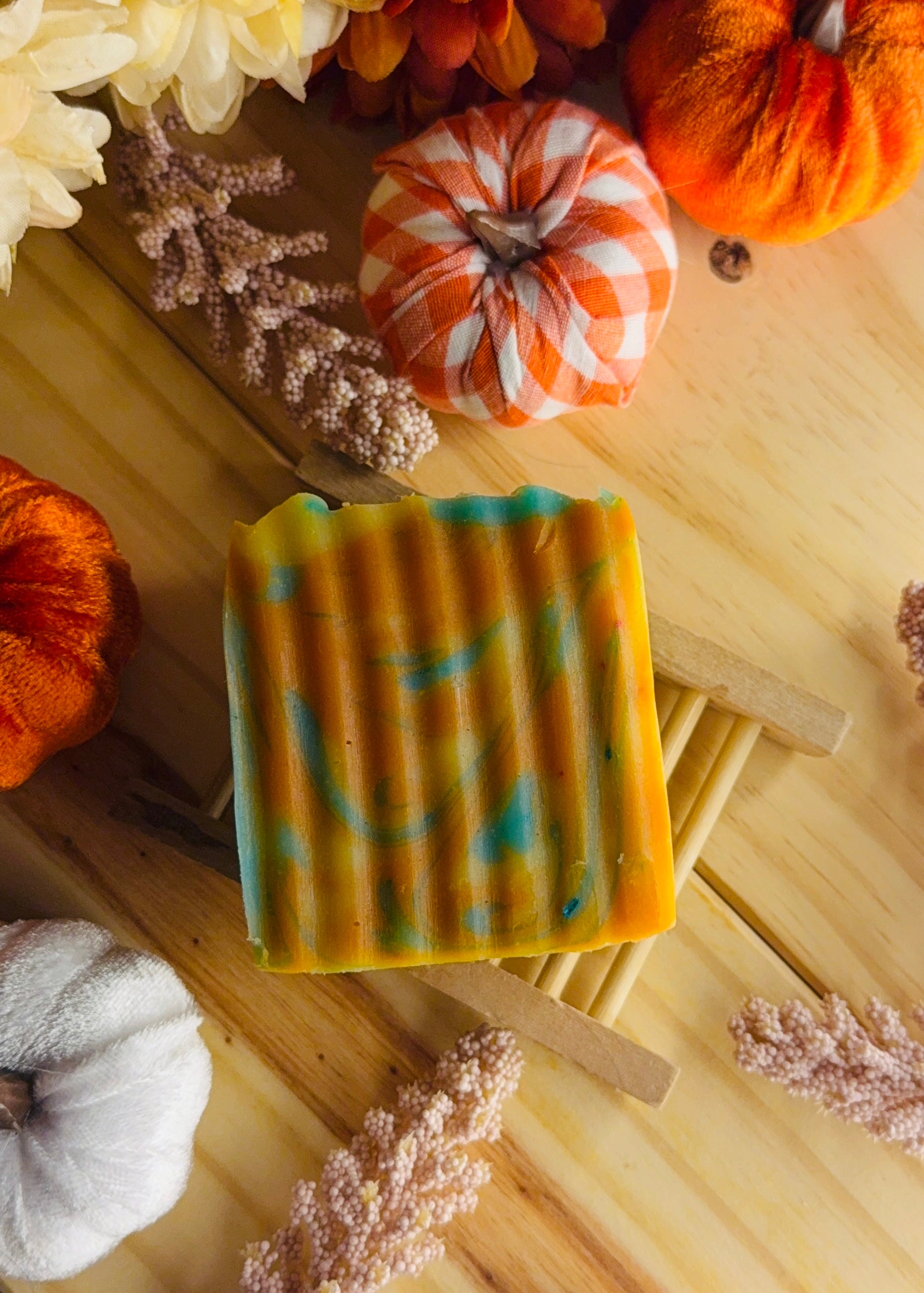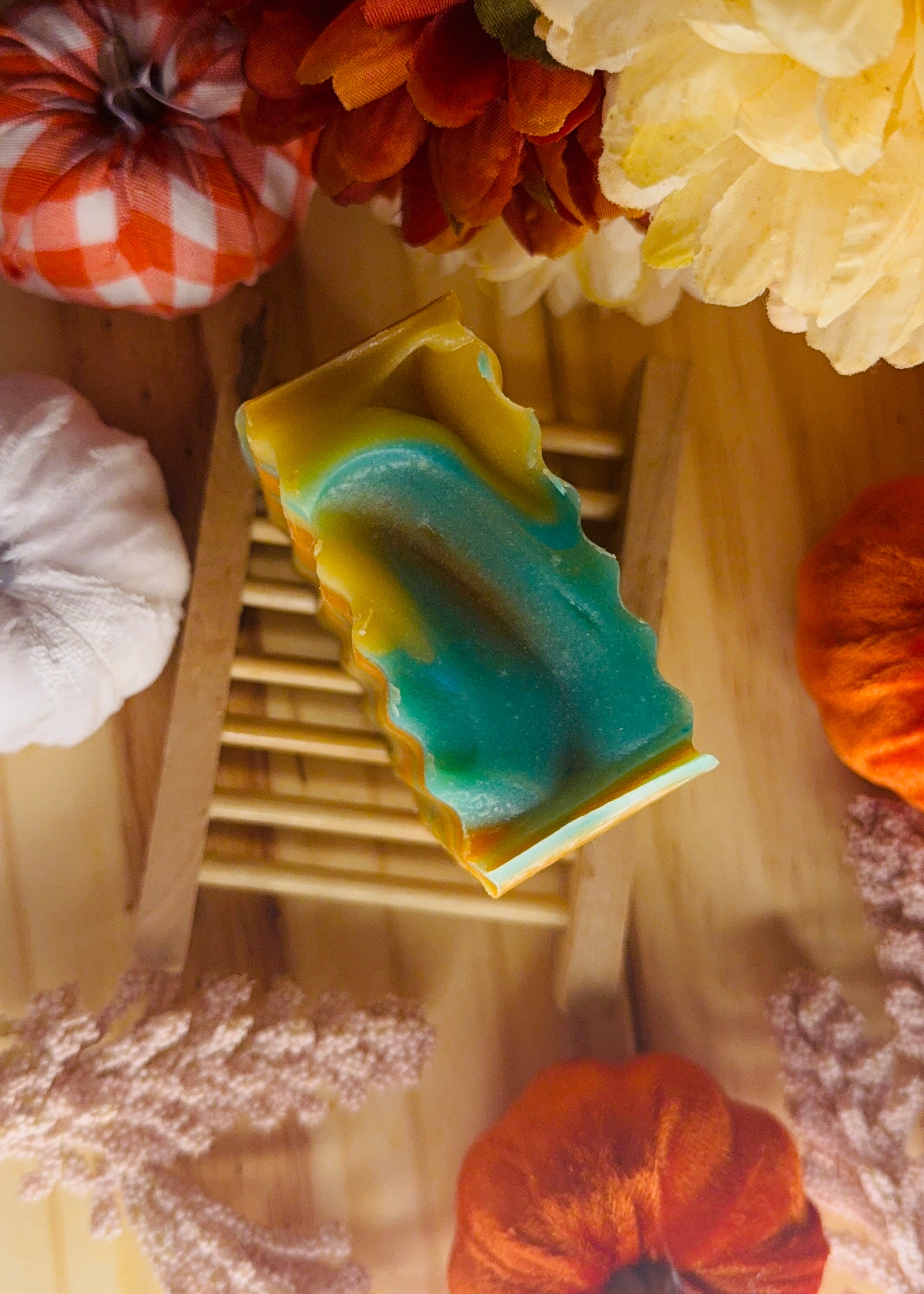Nuestro jabón artesanal de edición otoñal es una pieza única que combina arte y cuidado para tu piel. Sus tonos cálidos en naranja y dorado, con delicadas vetas turquesa, evocan la magia de las hojas cayendo en otoño. Elaborado con ingredientes nutritivos y suaves, limpia profundamente mientras mantiene la piel hidratada y radiante.